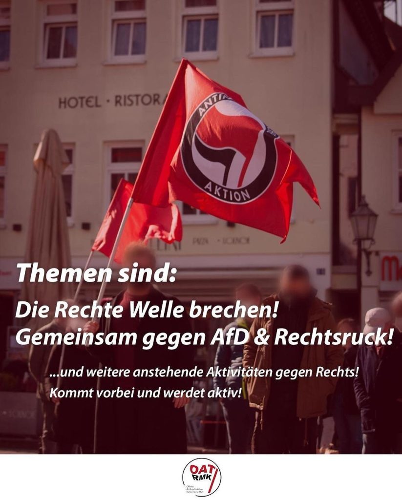 Jetzt ist Zeit zu handeln! 🚩Gegen den Rechtsruck hilft eine breite antifaschistische Organisierung im Betrieb und auf der Straße! Komm zum OAT und setze dich gemeinsam mit uns gegen Rechts und für einen solidarische Gesellschaft ein!